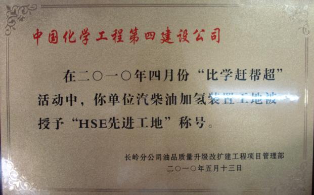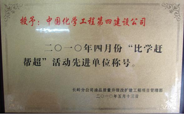在隨后的“4.30”控制點和“5.20”控制點施工中,項目部精心組織施工、日夜奮戰(zhàn)、齊心協(xié)力,順利完成了這兩個控制點,贏得業(yè)主和監(jiān)理的一致贊揚,在長煉樹立起四化建這面旗幟。在2010年4月,業(yè)主組織開展的“比學趕幫超”活動中,項目部從20多家參建單位中脫穎而出,榮獲了“文明工區(qū)獎”、“比學趕幫超活動先進單位”、“質(zhì)量樣板”、“HSE先進工地”四個獎項。在2010年5月,項目部又再次榮獲“比學趕幫超”活動先進單位。在施工中,先后有付承、張治冬、丁振華、周葵花、肖小健和劉立新獲得業(yè)主授予的“優(yōu)秀焊工”獎,朱文捷、李衛(wèi)紅兩人獲業(yè)主授予的“HSE”先進個人。