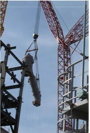 近日,內蒙古世林化工4×30萬噸/年煤制甲醇中國自主知識產權兩段式干煤粉加壓氣化示范爐的吊裝儀式在工程現場舉行。此活動由世林化工有限責任公司主辦。西安熱工研究院、五環設計院、杭州鍋爐公司、中石化寧波工程公司、四化建西北分公司以及鄂爾多斯、烏審旗等市旗的領導和現場人員均參加了儀式。該氣化爐由西安熱工研究院自主研發設計、杭州鍋爐公司制造,系中國自主知識產權的首臺示范爐。其爐體總重600多噸,分上下兩段吊裝,上午10點,現場啟用1250噸履帶式起重機起吊,吊裝高度38米,整個吊裝不到1小時,就將氣化爐的300多噸上段部分與框架內的下段部分穩妥就位。該爐的就位為配置附爐管線、加快施工進度贏得了時間。