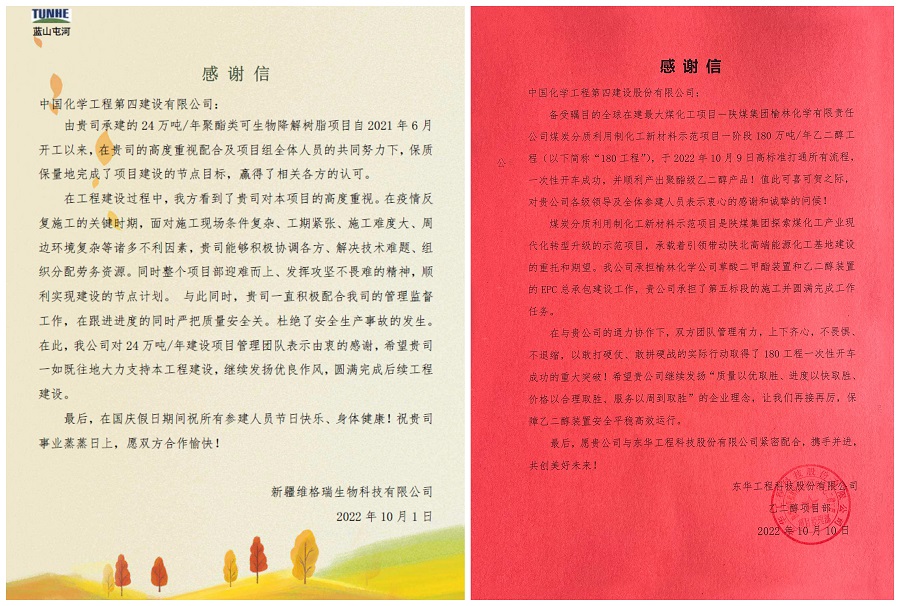 近日,新疆藍山集團維格瑞生物科技有限公司、東華工程科技有限公司和天津渤化永利化工有限公司等多家業主向公司發來感謝信,感謝公司優質高效的施工和良好的服務。