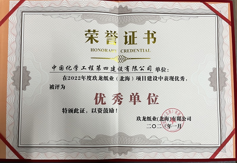 近日,西部公司北海玖龍紙業項目管理團隊因在項目建設中表現優秀,獲得玖龍紙業(北海)有限公司頒發的“優秀單位”榮譽稱號。