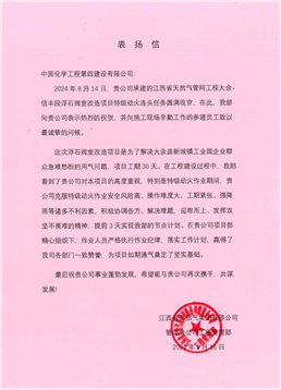 信中表示,在工程建設(shè)過程中,公司對項目建設(shè)高度重視,特別是特級動火作業(yè)期間,公司克服特級動火作業(yè)安全風(fēng)險高、操作難度大、工期緊張、強降雨等諸多不利因素,積極協(xié)調(diào)各方、迎難而上,提前3天實現(xiàn)節(jié)點計劃。在項目部精心組織下,作業(yè)人員嚴格執(zhí)行作業(yè)紀律,落實工作計劃,為項目如期通氣奠定了堅實基礎(chǔ),贏得了江西省天然氣集團各部門一致贊譽。