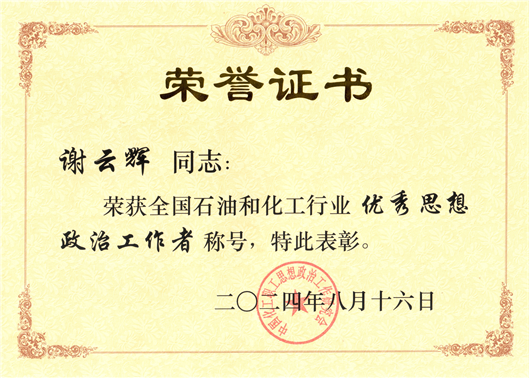 謝云輝獲評全國石油和化學工業(yè)優(yōu)秀思想政治工作者