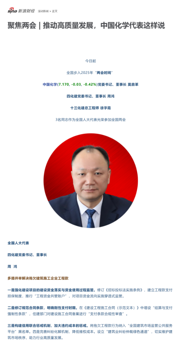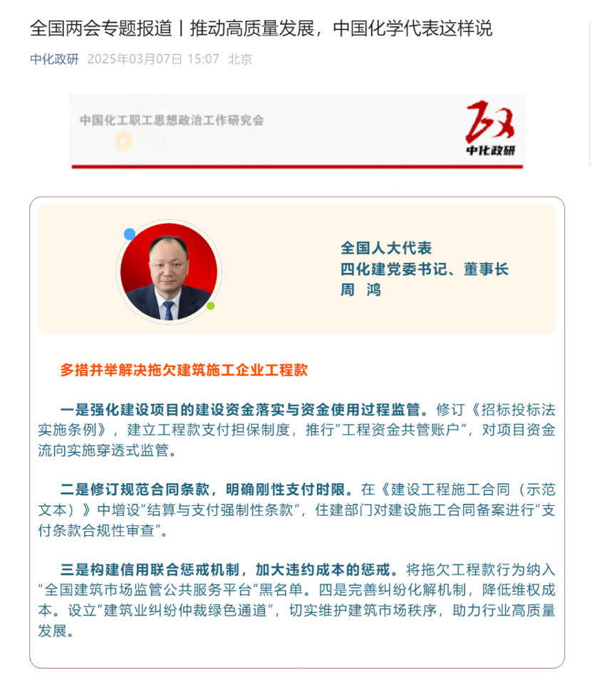 2025年全國兩會(huì)期間,全國人大代表,中國化學(xué)四化建黨委書記、董事長周鴻向大會(huì)提交《關(guān)于加強(qiáng)產(chǎn)業(yè)工人隊(duì)伍建設(shè)的建議》《關(guān)于多措并舉解決拖欠建筑施工企業(yè)工程款的建議》《關(guān)于推動(dòng)洞庭湖區(qū)常岳九鐵路、荊岳鐵路、監(jiān)利至華容至益陽鐵路規(guī)劃建設(shè)提速的建議》《關(guān)于修改最高法院〈關(guān)于大型企業(yè)與中小企業(yè)約定以第三方支付款項(xiàng)為付款前提條款效力問題的批復(fù)〉的建議》等4條建議,受到主流媒體深入報(bào)道,引起社會(huì)各界廣泛關(guān)注。