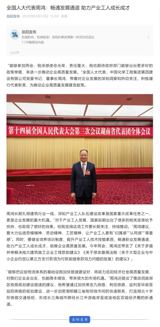 3月10日,岳陽日?qǐng)?bào)·岳陽發(fā)布微信公眾號(hào)以“全國人大代表周鴻:暢通發(fā)展通道 助力產(chǎn)業(yè)工人成長成才”為題報(bào)道周鴻參加2025年全國兩會(huì)。