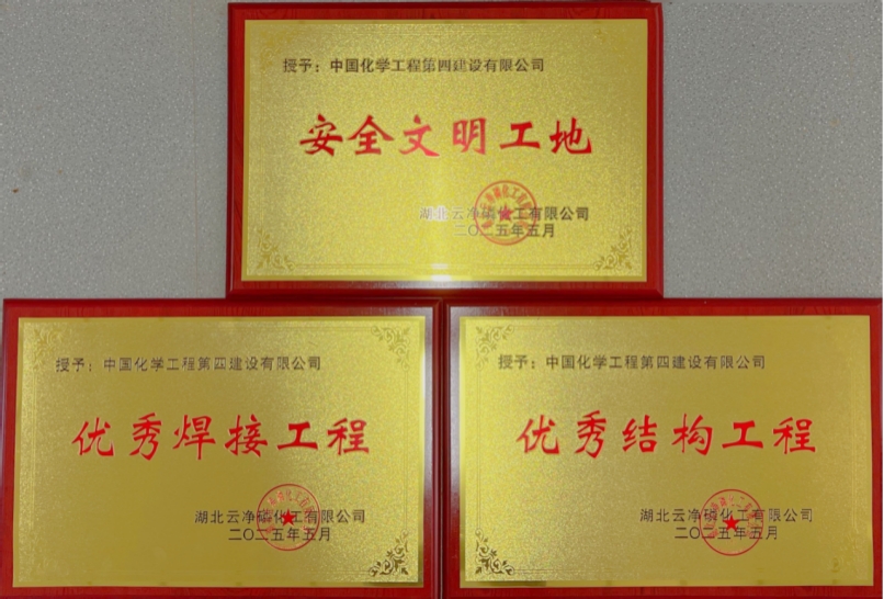 近日,由中南公司承建的湖北云凈磷化工有限公司40萬噸/年濕法凈化磷酸項目一期工程收到業主頒發的“安全文明工地”“優秀焊接工程”“優秀結構工程”三塊獎牌及感謝信,業主高度贊揚項目團隊展現出的卓越專業素養、頑強攻堅精神與強烈責任擔當。