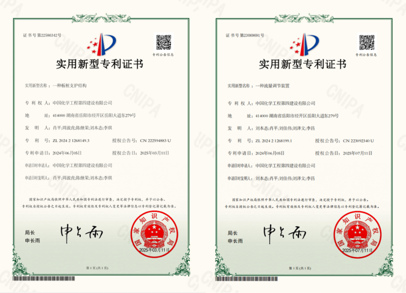 近日,西部公司技術創(chuàng)新喜結(jié)碩果,自主研發(fā)的“一種板樁支護結(jié)構(gòu)”“一種流量調(diào)節(jié)裝置”兩項技術分別獲國家知識產(chǎn)權局實用新型專利授權。
