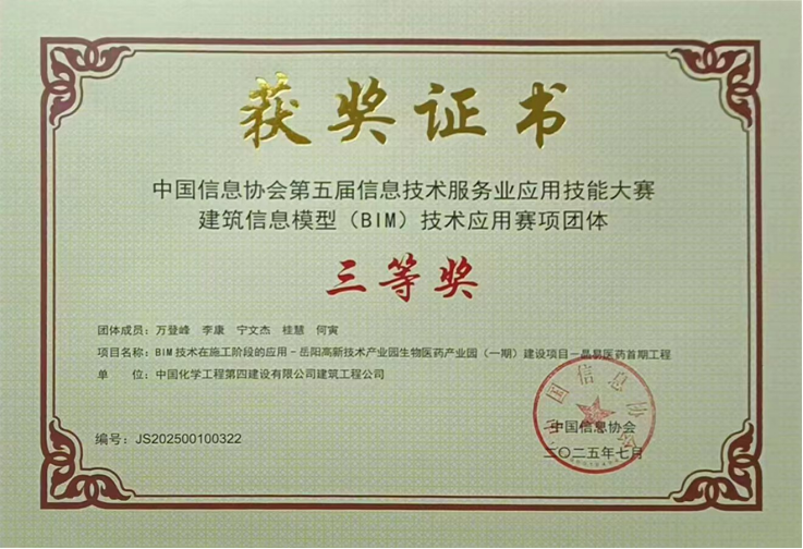 近日,在中國信息協會第五屆信息技術服務業應用技能大賽上,由建筑工程公司BIM技術小組成員萬登峰、李康、桂慧、寧文杰、何寅共同創作的參賽作品——《BIM技術在施工階段的應用:岳陽高新技術產業園生物醫藥產業園(一期)建設項目·晶易醫藥首期工程》,榮獲建筑信息模型(BIM)技術應用賽項團體三等獎。