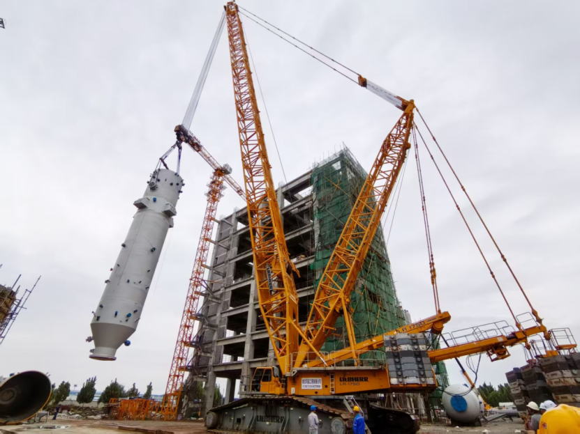 作為華強(qiáng)化工尿素生產(chǎn)線的“心臟”設(shè)備與整個升級改造工程的核心樞紐,此次吊裝的尿素合成塔高27.5米、直徑3米,其安裝精度直接關(guān)乎裝置投用后的運行效能。為了確保一次順利將這臺核心設(shè)備吊裝成功,項目部前期反復(fù)論證、優(yōu)化專項方案,最終確定采用“雙機(jī)抬吊”工藝:以1250噸履帶吊為主吊設(shè)備,搭配900噸汽車吊協(xié)同溜尾作業(yè),精準(zhǔn)匹配設(shè)備重量與現(xiàn)場工況。同時,項目部始終將“安全第一”貫穿全程,吊裝前嚴(yán)格開展吊索具全面檢查,科學(xué)劃定警戒區(qū)域,明確各崗位操作規(guī)范,全程實時監(jiān)控吊裝姿態(tài)與受力情況,最終實現(xiàn)設(shè)備“零誤差”精準(zhǔn)落位,整個作業(yè)安全高效、一氣呵成。