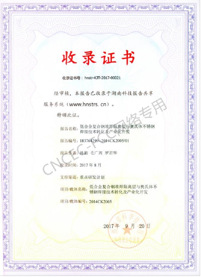 科技成果報告收錄證書:低合金復合鋼堆焊隔離層與奧氏體不銹鋼焊接技術轉化及產業化開發