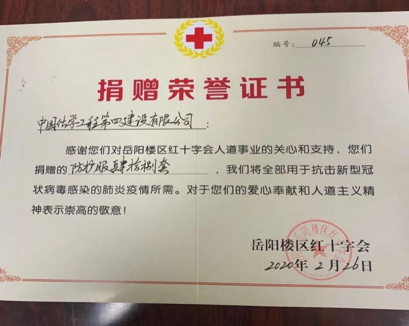 自新冠肺炎疫情發(fā)生以來,公司在積極抓好疫情防控和復(fù)工復(fù)產(chǎn)工作的同時(shí),切實(shí)履行社會(huì)責(zé)任,多方捐贈(zèng)防疫物資,馳援防控一線。2月26日,公司向岳陽市岳陽樓區(qū)紅十字會(huì)捐贈(zèng)防護(hù)服48套,專項(xiàng)用于支援岳陽樓區(qū)新冠肺炎疫情防控。這也是公司在抗擊新冠肺炎疫情的關(guān)鍵時(shí)刻,再次向社會(huì)捐贈(zèng)防疫物資。岳陽樓區(qū)紅十字會(huì)代表在公司基地接受捐贈(zèng),對(duì)公司的愛心捐贈(zèng)表達(dá)了誠摯的謝意,并向公司發(fā)放捐贈(zèng)證書。